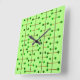 Cette horloge murale a un design moderne du milieu du siècle de lignes verticales noires avec des lignes verticales marron et des cercles verts.