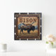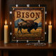 Cette illustration présente un arrière - plan en cuir foncé à outils avec un bison majestueux ou un bison dans un champ. Une chaîne montagneuse est visible derrière, baignée par la lumière chaude et terrestre d'un coucher de soleil. Le bas de l'oeuvre comprend le texte "BISON".