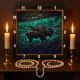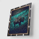 Cette illustration présente un arrière - plan en cuir néon foncé à outils avec un bison stylisé dans un champ. Une chaîne de montagnes est visible derrière, le tout dans des tons turquoises et bleu foncé. La texture en relief donne à l'oeuvre un aspect unique et frappant, mettant l'accent sur les contours du paysage et du bison.