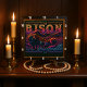 Cette illustration présente un puissant bison ou buffle dans un champ, dressé contre un arrière - plan d'une chaîne de montagnes au coucher du soleil. Toute l'oeuvre a une texture en cuir à outils particulière avec des couleurs néons vives dans le ciel et un avant-plan rustique foncé. Les mots "BISON, en haut.