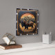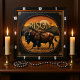 Illustration stylisée d'un buffle dans son habitat naturel, dressée sur un arrière-plan montagneux époustouflant. La pièce a une texture en cuir à outils distincte et une palette de couleurs chaudes et brillantes. La silhouette puissante de l'animal domine le premier plan, tandis que le texte "BISON" ajoute au design.