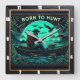 Cette illustration montre un chasseur dans un bateau au milieu d'un lac brumeux ou brumeux. La scène est pleine de détails comme les canards volants et nageurs, le tout rendu dans un style en cuir à outils avec des couleurs néon foncé. Les montagnes au loin et le texte "NÉ À LA CHASSE" ajoutent à l'atmosphère générale.