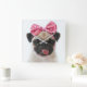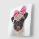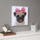 Chien Carlin avec la langue avec un ruban rose paillé, arrière - plan blanc.