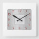 A minimalistic design of white and light grey, with red numbers.Rounded corners on a square wall clock, make this a special piece. Suitable for the kitchen or any space in the home this popular clock veut blend with interior colours.