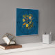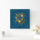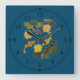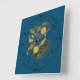 Koi swimming among lily pads and blossoms. Yellow, orange, et brown fish swimming among the green leaves and yellow flowers of lilis. Background a dark sea-blue. Original par Susan Lilly