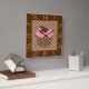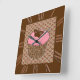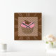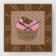 Strawberry Pink Frosted Cupcake topped with a chocolate butterfly in a decorative, chocolat ate brown brown damask patterned cupcake wrapper, on a brown, tan and coral pink chinese scalloped background clock