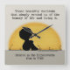 Little Boy est vu comme une silhouette assise devant le soleil couchant. Le mot "BEAUTÉ" est vu de manière frénétique dans différentes polices de caractères à travers le soleil alors qu'il brille sur l'horizon herbeux. Ce beau moment est inspiré par la belle citation de David A. Carrizales de Little Boy, Big Dreams et illustrée par Christie Black of Creations from the Heart.