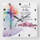 Cette horloge murale carré inspirante présente une croix aquarelle vibrante, mélangeant des tons de bleu, de rose et de violet. A côté, le message puissant "Ils lui murmurèrent Vous ne pouvez pas résister à la tempête qu'elle chuchota en retour. Je suis la tempête." est élégamment affiché, créant une déclaration audacieuse de force et de résilience.