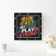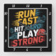 Cette horloge murale noire contient le texte "RUN FAST HIT HARD PLAY STRONG" dans une police stylisée. Les mots sont empilés verticalement, avec "EXPRES" en jaune, "HIT HARD" en bleu, et "JOUER FORT" en rouge. Les éléments graphiques comprennent des chaussures de course, une halle et un casque de football, suggérant le sport et l'athlétisme.