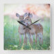 Deux jeunes faons debout dans la lumière douce du matin entourée de verdure.