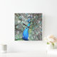 Photo d'un paon montrant ces plumes magnifiquement colorées. Profitez de regarder l'horloge avec ce beau plumage.