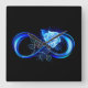 Luminous infinity symbol with glowing, beautiful, lushly blooming rose made of blue flames on black background.