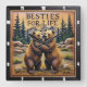 This appealing square wall clock features a highly dimensional illustration of two golden-brown bears hugging in a streamside mountain setting. The artwork is rendered in warm brown, green, and orange tones, strongly suggesting a deep carved relief or Engraved Wood Look. The bears have highly textured fur and are positioned in a landscape featuring a small stream, rocks, and green shrubs. The background includes dark green, stylized pine trees and blue-gray mountains under a pale orange sky. The carving style gives the entire image a strong three-dimensional, sculpted quality. The large, three-dimensional embossed text "BESTIES FOR LIFE" is carved across the top. The clock face features a simple clock face border with large, white, numbered tick marks (1 to 12) integrated into the outer frame. The artwork is surrounded by a thick, dark brown decorative border that resembles a black wood frame.