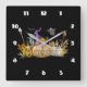 A clock with a cute image of a haunted pumkin house with big witches on top and ghosts and bats flying around.