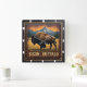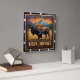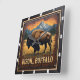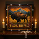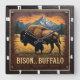 Illustration puissante d'un bison dans la nature, avec une chaîne de montagnes accidentée au loin. L'arrière - plan a une texture en cuir stylisé, à outils, et le ciel est peint avec les couleurs chaudes d'un coucher de soleil. Le texte "BISON, BUFFALO" est une partie importante du design.