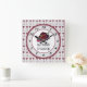Il s'agit d'une horloge amusante pour la zone de la cuisine ou du bar de loisirs, avec de longues verres à vin rouge remplis de vin rouge qui forment un motif arrière - plan. Les images sont placées sur un arrière - plan argenté pâle, avec un cadre rouge marron autour des chiffres noirs.Le centre est blanc, avec une image de grappe et le texte amovible ou modifiable qui dit actuellement "C'est le vin O'HORCK.