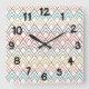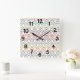 Cette pendule murale est décorée dans un style art déco de Vs à l'envers dans des couleurs rétro d'orange, turquoise, or, noir, rouge, marron et gris.