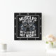 Cette horloge murale noire présente le texte "MUSCLES SONT CONSTRUITS AVEC EFFORT PAS VOULU" dans une police blanche stylisée et audacieuse avec un contour bleu. Les mots sont disposés autour d'un graphique central d'un individu musclé, qui semble être un homme à la peau claire, exécutant un rang de cloche. L'arrière - plan est d'un bleu texturé et gris, ce qui laisse penser à un aménagement de gymnase. La conception favorise le travail et l'effort dans la construction musculaire.