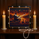 Cette illustration représente un chasseur dans un bateau sur un lac, engagé dans la chasse au canard au lever du soleil. L'oeuvre est composée d'une texture en cuir avec une palette de couleurs spectaculaires : bleus foncés, violets et oranges ardentes du lever du soleil. On voit des canards nager dans l'eau et voler au-dessus, tandis qu'une forêt dense et des montagnes forment l'arrière - plan lointain.