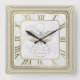 A holiday theme design of the Christmas "Angel of Joy" decorated with metallic gold and white pearls holding a pearled heart-shaped plaques with the text, "Joy"over a white lace background framed by a golden square roman Numeral clock and narrow gold squares.