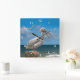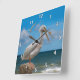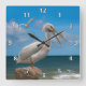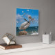 Ce magnifique pélican blanc américain est connu pour ses yeux bleu vif et ses anneaux oculaires roses. Il développe un bouton sur son bec pendant la saison de reproduction. On le voit debout sur une roche au bord de l'eau, et une mouette vole au-dessus de l'eau. Le ciel bleu rempli de nuages bouffants et les vagues de l'océan bleu vert est sa toile de fond. Customisez en ajoutant votre propre légende, nom ou monogramme.
