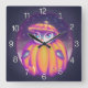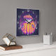A cute penguin with big blue eyes wearing an orange pumkin costume with snow in the night sky background. It has bright colors and a painterly feel to the drawing.