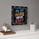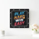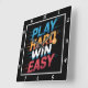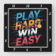 Cette horloge murale noire comporte le texte "PLAY HARD WIN EASY" empilé en caractères gras, légèrement déprimés avec des dégradés de couleur : bleu pour "PLAY", orange pour "HARD", blanc pour "WIN" et rouge pour "EASY". Un ballon stylisé de basket est incorporé dans le mot "DUR". Les lignes de vitesse horizontales mettent l'accent sur le texte, transportant l'énergie et le mouvement. Le design est basé sur le sport et la motivation.