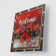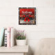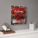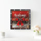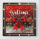 This square wall clock features a bold, festive illustration dominated by a striking red satin bow at its center. The background is a vibrant mix of red and black horizontal bands, overlaid with white script reading "Welcome". The entire scene is decorated with numerous gold and white snowflakes, and white, powdery snow drifts across the bottom. A ribbon border separates the colors horizontally. The inner square is edged with a thin gold-colored frame, and the whole design is set within a wide, dark outer wood-look frame, which is simulated using high-detail artwork and is not real wood.