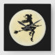 Image d'une silhouette de sorcière chevauchant un balai devant une lune brillante. La sorcière a de longs cheveux soufflant dans le vent, un casquette pointu de sorcière, habillé d'une jupe et de chaussures à talon élevé. Placez-vous sur du noir solide.