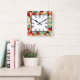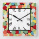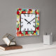 Horloge murale en acrylique carré de 10,75 po x 10,75 po avec une image amusante rétro de taches rouges, orange, jaunes, vertes et bleues sur le noir et une face d'horloge romaine dans un carré blanc avec une bordure noire. Voir l'ensemble de la collection Nifty les années 50 Clock dans le DECOR | Section Horloges. Ce produit n'est pas associé ou affilié au titulaire du droit d'auteur d'origine.