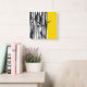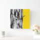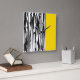 Wall clock printed with original and white abstract stripes with bold yellow stripe.