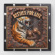 This dramatic square wall clock features a highly dimensional illustration of a large tiger roaring and a small monkey smiling right next to it. The entire design is rendered in rich orange and dark brown tones, strongly suggesting a deep carved relief or Engraved Wood Look. The tiger has textured fur and the monkey is cheerfully clutching the tiger's side. They are framed by a central hollow tree trunk and numerous stylized leaves carved into the dark wood background. The carving style creates a strong three-dimensional effect, emphasizing the depth and texture. The large, three-dimensional embossed text "BESTIES FOR LIFE" is carved across the top. The clock face features a simple clock face border with large, white, numbered tick marks (1 to 12) integrated into the outer frame. The artwork is surrounded by a thick, dark brown decorative border that resembles a black wood frame.