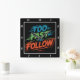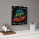 Cette horloge murale noire comporte le texte "TROP RAPIDE À SUIVRE" empilé dans une police audacieuse, légèrement désorientée, avec un dégradé de couleurs bleu, vert et orange. Les mots sont soulignés avec des stries dans les couleurs correspondantes, suggérant la vitesse et le mouvement. La conception est affirmée et implique un sentiment d'avance ou d'avance rapide.