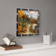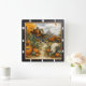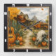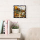 Cette horloge murale carré saisit une scène d'automne du sud-ouest avec un ranch rustique, un camion vintage orange chargé de citrouilles, un crâne de vache patiné et un feuillage d'automne éparpillé. Un casquette cowboy avec une étoile se repose près d'une guitare, évoquant l'esprit de la vie de ranch dans le désert en Arizona pendant l'automne.