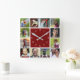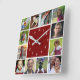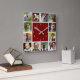 A colorful wall clock with 12 personal photos placed around the clock face of a dark color. The photos are easily replaced with you own by using the template.