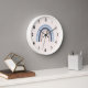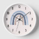 Une horloge avec un arc-en-ciel mignon et capricieux. Aquarelles bleu et pêche.