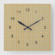 Des cercles dorés s'entassent pour former un motif de courrier à chaîne sur un arrière - plan beige jaunâtre. Les chiffres noirs et les mains sont facilement visibles contre l'image.