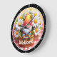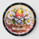 Cette charmante horloge ronde présente un adorable nain assis dans un panier tressé rempli de marguerites blanches, le tout sur un fond à carreaux rouges et blancs. Un panneau "Bienvenue" orne le panier, ajoutant une touche amicale. Cette horloge fantaisiste est parfaite pour une cuisine, une nurserie ou comme accent joyeux dans n'importe quelle pièce, apportant une atmosphère délicieuse et invitante.
