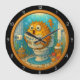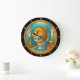 Cette image est une horloge murale circulaire avec une jante noire et des chiffres blancs, avec une illustration fantaisiste d'un poisson-puffin orange à l'allure choquée portant des lunettes de plongée libre et lisant un journal intitulé "Dolphin Times" assis sur une toilette. Sous l'eau, murs carrelés bleus, algues, étoiles de mer et hippocampe. Les bulles flottent autour du caractère décalé, le tout enfermé dans un cadre intérieur doré.