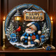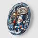 Ce charmant visage d'horloge présente une scène hivernale festive avec le Père Noël dans un foulard et casquette rayé bleu et blanc. Il est entouré de pins enneigés, d'un lampadaire lumineux et d'un cardinal rouge vif perché à proximité. Une corbeille remplie de fleurs et de baies bleues vinicoles est assise sur son côté, et une pancarte en bois au-dessus indique "JOYEUX JOURS DE VACANCES". Les aiguilles de l'horloge sont noires et sont dressées contre un arrière - plan de flocons de neige et un mur en bois bleu foncé.