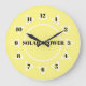 Une horloge murale jaune pâle avec une empreinte d'un soleil, conçue pour favoriser l'énergie solaire.