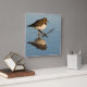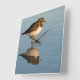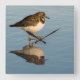 Une photographie d'un oiseau de bécasseau marchant sur l'eau d'océan au coucher du soleil. Vous pouvez voir la réflexion du bécasseau dans l'eau.