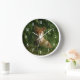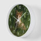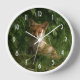 Une horloge avec une photo montrant un mignon petit renard à fourrure rouge et blanche. Entouré de feuilles et d'herbes verdoyants.