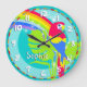Horloge murale graphique aux couleurs arc-en-ciel pour enfants avec un perroquet ara graphique sur les paumes conçue par Sarah Trett. Personnalisez avec le nom court de votre choix, cet exemple indique Sophie. Serait un excellent ajout personnalisé à la jungle tropicale, à la faune ou à la chambre colorée de votre enfant.