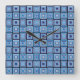 Horloge murale avec un design audacieux et funky de petits carrés dans différentes nuances de bleu. La répétition dans ce design a créé une illusion d'optique et les carrés semblent se déplacer et surgir sur vous.