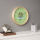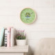 Une horloge murale verte avec des chiffres, une illustration d'une grenouille mignonne sur son étang et texte personnalisable ci-dessous! Parfait pour ajouter une touche amusante à la chambre des enfants !