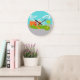 Cette horloge murale acrylique ronde de la maison de dessin moderne du milieu du siècle vous permettra de sortir le tapis WELCOME et de vous faire à la maison! Dans les années 1960, le design minimaliste de l'art se compose d'une élégante maison en pierre orange et en verre d'eau sur une pelouse verdoyante et verdoyante en forme de boomerang. La pelouse forme une oasis au milieu de son environnement gris et bétonné. Un palmier vert se balance dans la brise. Quatre pierres de pas orange mènent à la porte d'entrée rétro, rouge, avec trois vitres rectangulaires en verre. A gauche de la porte, un fleerpot turquoise abrite une plante tropicale et verte. La maison a un toit blanc en V incliné qui pointe vers deux nuages blancs en forme de haricot. Le ciel est une ombre d'aqua positivement sereine. Personne ne voudra jeter des pierres de ce design moderne de maison en verre ! Achetez ce produit kitschy, space age et soyez le chat le plus cool de votre bloc !