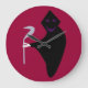 Cette horloge impressionnante présente une image de la Grande Faucheuse créée à l'aide de vecteurs. Il tient menaçamment son escroquerie dans sa main blanche osseuse. Ses yeux violets enfoncés et son sourire démoniaque ne sont visibles que sous son manteau noir.