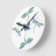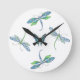 Design original par Sandra Gale de deux libellules fantaisistes en bleu et vert autour d'un papillon comme centre de l'horloge.
