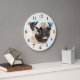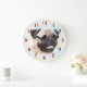 Dessin numérique d'un Carlin. Cette oeuvre artistique de Diane Blackman est basée sur une photographie. C'est un jeune Carlin à l'expression joyeuse. L'arrière - plan est un tourbillon de couleurs pastel à la texture mosaïque. Les chiffres de l'horloge sont brun rougeâtre foncé.